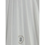 The Pleated Skirt by Brunello Cucinelli is crafted from techno poplin, blending a sporty attitude with refined elegance. The design features flat pleats that enhance its feminine appeal, while the drawstring waist with contrasting details adds a modern accent. Integrated technical jersey shorts ensure comfort and ease of movement, making it perfect for both leisure and sport. The iconic Solomeo heraldic crest completes the look with a signature touch of sophistication.