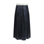 The foil-treated midi Skirt by Maison Margiela expresses the brand’s experimental spirit through a bold yet refined design. Its medium-to-long length creates a clean, elongated silhouette, while the metallic foil finish adds shine and visual depth. The metal belt brings a sharp, architectural accent, balanced at the back by the signature four stitches that subtly mark the Maison’s identity. A statement piece designed to bring modern edge to even the most understated looks.