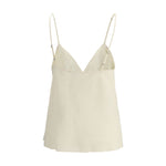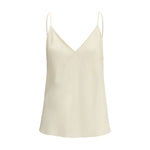 Forte_Forte’s satin Top is a refined and versatile garment featuring a shiny fabric that catches the light with elegance. The thin, adjustable straps ensure a custom fit, while the V-neckline delicately enhances the cleavage line. Perfect for pairing with both casual and more formal looks, it is a must-have with sophisticated appeal.