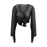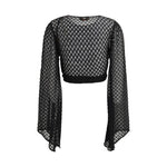 The wrap Top in lamé viscose by Missoni blends luminous texture with refined craftsmanship through its raschel knit and spiderweb motif. Designed with long sleeves and a wrap-style front, it drapes elegantly while the lamé finish adds depth and subtle movement. A sophisticated piece that elevates both evening and resort looks with Missoni’s signature glow.