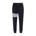 Cotton Sweatpants by Thom Browne, elasticized waistband with adjustable drawstring, two welt pockets on front, iconic white bands on left leg, iconic brand patch applied in contrast on back, jogger style.