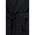 The double-breasted virgin wool Blazer with belt by Valentino expresses the Maison’s sartorial elegance through a bold and refined silhouette. The design is defined by wide satin peak lapels that create a sophisticated textural contrast, while the covered button fastening preserves a clean, balanced line. Front flap pockets add a classic touch, completed by a virgin wool belt with fringe that highlights the waist and signs the piece with Valentino’s distinctive style.