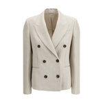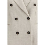 The Button Herringbone Blazer by Brunello Cucinelli showcases the brand’s refined tailoring through a timeless herringbone weave. Its double-breasted fastening and classic notched lapels emphasize a structured elegance, while the buttoned cuffs complete the silhouette with discreet sophistication. A versatile piece that blends heritage craftsmanship with contemporary ease.
