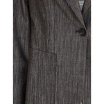 Brunello Cucinelli’s Blazer is a refined garment that combines traditional tailoring with a touch of contemporary flare. Made of lurex fabric, it brings discreet and sophisticated shine to the look. It features a button closure, classic lapels, a chest pocket and two patch pockets on the front. The back slit ensures comfort in movement, while the partially lined construction maintains its lightness. Perfect for completing both formal and casual-chic outfits with elegance.