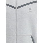 Brunello Cucinelli’s cotton Hoodie features a high collar for added comfort and protection. The front closure with a double-slider zipper allows for easy adjustment, while the two patch welt pockets on the front add functionality. Elasticized cuffs and an elasticized hem ensure a snug, comfortable fit. The mélange pattern gives the garment a modern and sophisticated look, making it perfect for a casual and stylish look.