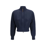 The knitted Cardigan by Brunello Cucinelli embodies refined, luminous elegance, crafted from dense cotton and enhanced with all-over lurex detailing. The straight-cut silhouette and stand-up collar create a clean, modern line, while ribbed cuffs and hem add subtle structure. The zip fastening is enriched with a decorative Monili chain, an iconic signature of the Maison that lends a precious and sophisticated accent. A versatile piece designed to effortlessly elevate both everyday outfits and more polished looks.