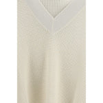The cashmere net Sweater by Brunello Cucinelli embodies a soft, luminous femininity, defined by the perfect balance of lightness, airiness, and a naturally enveloping feel. The fine cashmere yarn is crafted into an open net stitch, creating a refined interplay of texture, transparency, and movement. Its relaxed silhouette is enhanced by dropped shoulders and wide sleeves, while the ribbed V-neckline adds a touch of understated elegance. Finished with rib-knit cuffs and hem, this piece elevates knitwear to its most sophisticated and timeless expression.