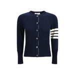 The virgin wool Cardigan by Thom Browne features a casual style and a regular fit. Crafted from pure virgin wool, it comes with a crew neck, regular shoulders, and long sleeves. The iconic four contrasting Thom Browne jacquard stripes accent the hem, while ribbed button cuffs add a signature touch. The piece is finished with a button closure, flag logo insert, dog embroidery at the back, and side slits with buttons.