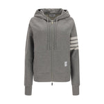 Cotton Hoodie by Thom Browne, zip closure, adjustable drawstring hoodie, front kangaroo pocket, ribbed cuffs and bottom hem, logo patch on front, striped print on left sleeve.