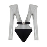 Dolce & Gabbana Silver Long Sleeve Swimsuit. In silver and black, long sleeves, padded shoulders, deep neckline, elasticated belt with removable logo.