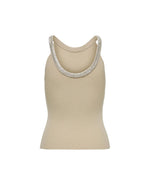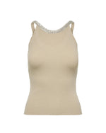 Womens beige sleeveless round neck t shirt by Only Made with 20% nylon and 80% viscose Machine washable at 30° Versatile and easy to style Perfect for spring/summer 20% nylon – 80% viscose Size on Tag: M