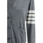 Thom Browne Cardigan made of soft merino wool, featuring a monochrome design and slim fit. Featuring a V-neck with ribbed trim, it has a front button closure and two patch pockets on the front. The brand’s iconic horizontal bands decorate the left arm, adding a distinctive touch. Slight adjustable side slits with buttons complete the garment, for greater freedom of movement. A refined and versatile garment, perfect for smart or casual looks.