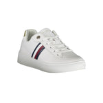 Step into the realm of effortless style with these Tommy Hilfiger sneakers. These shoes are a fashion-forward statement piece with their pristine white color, punctuated by contrast details that showcase a dynamic edge. The iconic Tommy Hilfiger logo adds a touch of prestige to your everyday look. Crafted with a perfect blend of materials—polyester for durability, leather for a superior feel, and polyethylene for comfort—every step promises to keep you at the peak of style and comfort.