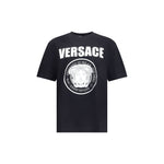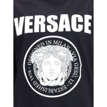 Cotton T-Shirt by Versace featuring a ribbed crew neck and iconic contrasting monogram on the front, embellished with a Medusa maxi head. A distinctive garment that combines comfort and bold style.