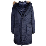 Add men’s long nylon down-filled down jacket, hood with murmanski fur, button and zipper closure, mock inner vest with zipper closure, two front and two chest pockets