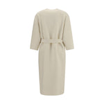Long Coat by Aftercoat features a classic crew neck that lends an elegant, understated look. The front button closure adds a touch of sophistication, while the matching knotted sash at the waist allows you to customize the fit, creating a defined silhouette. The two side welt pockets add functionality without compromising the clean aesthetic of the design.