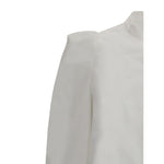 The White Alexander McQueen Shirt is crafted from 100% Cotton and features a mandarin collar, button closure, and ruffled shoulders, offering an elegant and feminine design with a contemporary edge.