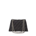 Crush Medium Denim Shoulder Bag. In black denim, iconic and slightly curved structured shape, chain shoulder strap and metal logo on the front. Covered snap button closure, two internal compartments and zip pocket