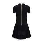The flared knit mini Dress by Balmain showcases the Maison’s signature blend of structure and femininity. Crafted in a refined knit enhanced with tubular detailing, it features a V neckline embellished with the iconic Lion Head button, adding a touch of unmistakable Balmain heritage. The short sleeves and the wide waistband sculpt the silhouette, while the flared line lends movement and elegance. A visible back zip with a Balmain Paris–engraved puller completes the dress with a modern, luxurious accent.
