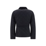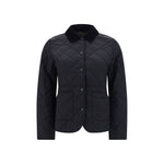 The Deveron Quilt Jacket by Barbour, classic velvet ribbed collar, snap button front closure, two slit patch pockets on front, iconic brand monogram embroidered on front, all-over quilted design, monochrome pattern, regular fit.