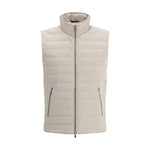 The quilted Vest Jacket by Brunello Cucinelli features refined padding that offers both lightness and warmth. The design includes a front closure with a two-way zipper, two welt pockets on the front, and a slightly raised collar that adds elegance and protection. A versatile and sophisticated piece, ideal for completing both casual and more polished looks.