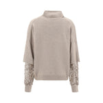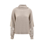 Brunello Cucinelli’s cashmere turtleneck Sweater is a sophisticated and stylish piece featuring a ribbed high collar that offers comfort and style. The dropped sleeves give a relaxed look, while the high ribbed cuffs and hem add definition to the design. A unique detail is the double layer on the sleeves, with a ribbed short-sleeve top and a semi-transparent fabric bottom, embellished with sequins that add a touch of sparkle to the garment. The oversized fit makes the sweater comfortable and modern, perfect for an elegant yet relaxed look.