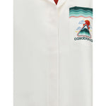 The all-over print silk Montagne Ondulée shirt, inspired by Japanese iconography, features a Cuban collar, hidden CC buttons and Memphis stripe detailing.