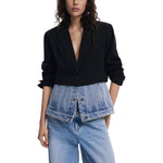 Discover the Desigual AME_VIRGINIA 25SWEW28 women’s blazer, an iconic piece that combines elegance and originality. This blazer features a unique design with a tailored upper section and a striking denim insert at the bottom, creating a trendy layered effect for those who love to stand out. Made with a high-quality blend (45% cotton, 36% polyester, 17% viscose, 2% elastane/lycra), it offers comfort, a flattering fit, and pleasant stretch for freedom of movement. Perfect for casual-chic looks, it pairs easily with trousers or skirts for stylish outfits in any season.