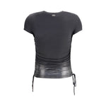 The jersey Top with side drawstrings by Diesel features a slim and slightly stretchy fit, ensuring comfort and a flattering silhouette. The adjustable length, achieved through the side ties, adds a versatile and original touch to the design. It is detailed with a classic round neckline and short sleeves, while the back is adorned with a small metal plaque featuring the iconic Oval D logo. The gradient foil application rising from the hem creates a dynamic and contemporary visual effect, perfect for a modern and distinctive look.
