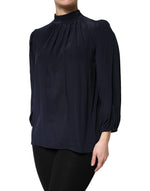 Dolce & Gabbana Blue Silk Mock Neck Long Sleeves Blouse Top