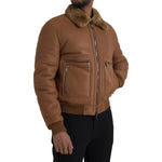 Dolce & Gabbana Brown Leather Fur Button Biker Coat Jacket