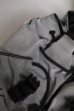 This item is a store sample, there are stains on the front and bottom side, a cut on the drawstring and missing color on the metal clips (see pictures for details).