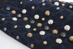 Color: Gray wool; blue leopard print canvas; gold and silver studded detailing