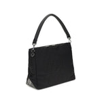 Lui large Shoulder Bag by Fendi is an accessory with a contemporary design and soft construction, designed to combine style and functionality. Made of black padded FF nylon with a shiny, slightly embossed texture, it is finished with tone-on-tone smooth calfskin details. The double-slider zipper closure and metal FF appliqués on the corners add character and recognition. The spacious, fabric-lined interior includes a handy flat pocket, while satin-finish ruthenium metal hardware completes the look with an industrial, elegant touch.