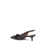 The Gancini slingback Pumps by Ferragamo combine classic elegance and iconic details. The softly rounded neckline enhances the silhouette of the foot, giving it a harmonious and feminine line. The famous Gancini ornament, proposed in a bold version with a gold finish and maxi lines, adds a touch of distinctive character to the sophisticated design.
