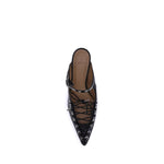 Ganni’s Oleatex laced Mules are inspired by the lace-up boots of the 1920s, combining nostalgia and contemporary appeal. Made of crinkled Oleatex Fabrics of the Future, they feature metal eyelets, waxed crisscross laces, a long tapered toe, and an iconic mini heel with a GANNI butterfly logo and chrome finish for a distinctive, modern touch.