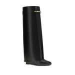 The leather Shark Boots combine boldness and sophistication. With a distinctive Shark line, they feature a metal clip engraved with “GIVENCHY” and gold-finish metal details that enhance the design. The straight cut offers a versatile and comfortable fit, while the pointed toe and covered wedge add a touch of elegance. Perfect for those looking for a boot that combines style and practicality, ideal for completing sophisticated and modern looks.