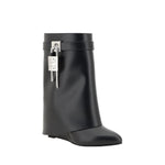 Givenchy’s Shark Lock leather Ankle Boots stand out for their bold and sophisticated design. Featuring an almond toe and a distinctive trouser-style shaft, they combine structured elegance with a contemporary spirit. The padlock detail on the side panel adds an iconic and distinctive touch, while the wedge heel ensures momentum and stability.
