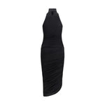 The La Piazza midi Dress by Jacquemus features a high neck and ruched details that give movement to the garment. Sleeveless and sleeveless, it features an asymmetric hemline that adds a modern and sophisticated touch to this elegant and contemporary design.