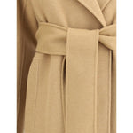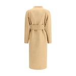 The Deena Coat by Khaite is a wrap-around design with raglan sleeves, made from fine double-face wool. Featuring bold lines and refined epaulettes, it stands out for its balance of structure and softness. The wide, scarf-like sash belt allows you to emphasize the silhouette or wear it open for casual elegance.