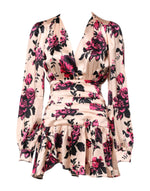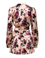 Laneus Pink Floral Silk Long Sleeves V-neck Wrap Mini Dress