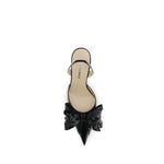 The Cadeau Wrapped Leather Pumps by Mach & Mach, made of glossy leather, stand out for their pointed toe, tonal bow, and ankle strap. The high, slender heels complete the elegant and feminine design, perfect for sophisticated and glamorous looks.