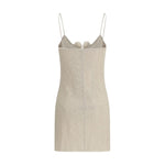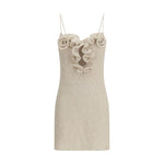 The sleeveless crêpe beach mini Dress by Magda Butrym is a short, lightweight beach dress designed with slim shoulder straps and a softly fitted silhouette. The front features a deep, decorative neckline twisted into floral shapes, adding a distinctive and feminine touch. The textured fabric and handcrafted detailing give the piece a romantic, effortless summer character, perfect for warm seaside days and evenings.
