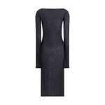 Miu Miu’s Long Jersey Dress is a piece that combines comfort and sophistication. Featuring an elegant boat neckline that enhances the neckline, this dress features long sleeves for a touch of class and versatility. The stitched logo on the front adds a distinctive and discreet detail, making the dress recognizable without sacrificing understatement. Perfect for casual occasions or casual-chic evenings, it is a versatile and sophisticated piece in every woman’s wardrobe.