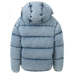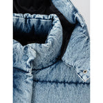 Puffy down jacket in Miu Miu denim. Covered front zipper and button closure, two zippered side pockets, removable hood.Applied logo on back. Puffy pattern, fully padded, elastic cuffs and adjustable drawstring waist. Inner SKU: 24 LU 10. Composition: 100% Polyester-Inner SKU:24LU10
