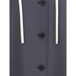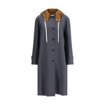 Miu Miu’s hooded long Coat blends a tailored silhouette with contrasting elements, such as the sleeves and detachable hood made of technical fabric. Featuring buttoned cuffs and a practical drawstring in the hood, it has a front button closure and welt pockets. A versatile garment that combines classic elegance with contemporary functional details.