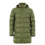 Moose Knuckles Green Padded Down Jacket. Medium-length, front zip fastening with covered buttons, two large side welt pockets with zip closures. Removable hood, light padding, logo applique on the sleeve. Composition: 74% Nylon, 26% Cotton