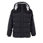 Moose Knuckles Black Hooded Padded Jacket. Front zip fastening with covered buttons, two side zip pockets, adjustable and removable hood with contrasting silver detailing on the inside. Silver interior, zip pocket. Logo patch on the sleeve. Composition: 74% Nylon, 26% Cotton