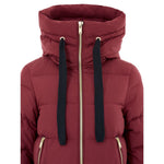 Burgundy Padded Down Jacket with Gold Zip by Moose Knuckles. Front fastening with gold metal zip, two large side pockets with zips, medium length, stretch knit inner detailing and Velcro straps on the cuffs. Adjustable hood with large drawstring, side zips. Small leather patch with metal logo on the sleeve. Composition: 74% Nylon, 26% Cotton
