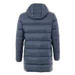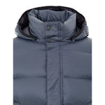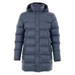 Moose Knuckles Mid-Length Down Jacket in Grey. Front zip and covered buttons, two large side pockets with zips, and an adjustable and removable hood. Small logo patch on the sleeve. Composition: 74% Nylon, 26% Cotton